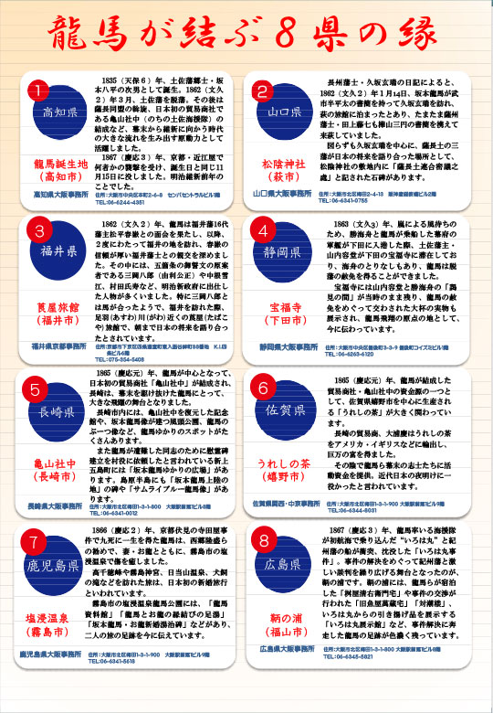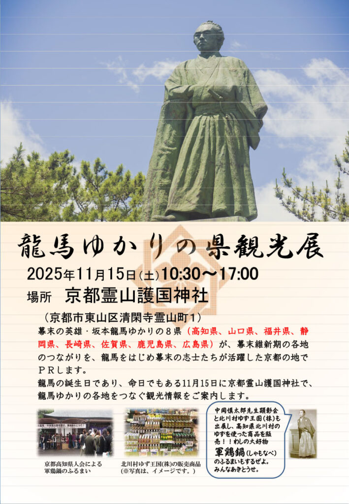 坂本龍馬の誕生日であり、命日でもある11月15日(土)に京都霊山護国神社にて、龍馬ゆかりの県事務所が共同で観光PRを行います。広島県からは、坂本龍馬に扮してガイドする「鞆龍馬観光おもてなし隊」が登場します。日時:11月15日(土)10:30~17:00場所:京都霊山護国神社