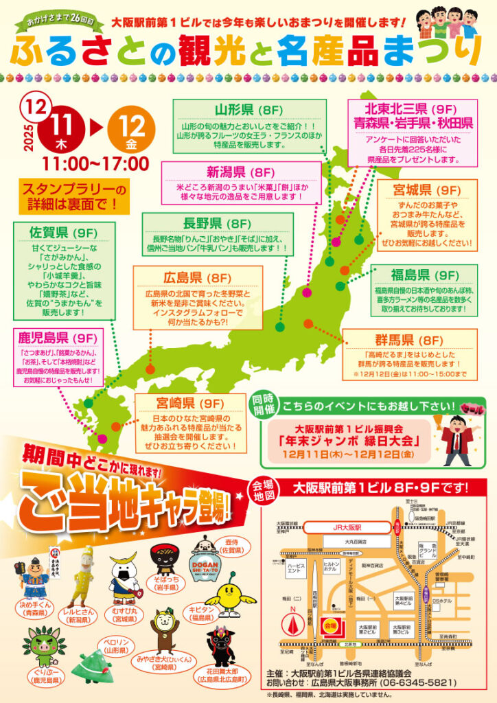 大阪駅前第1ビル8階、9階の13県の各県事務所で、名産品の販売や観光PRを実施します。8階の広島県大阪事務所では、北広島町の新米(こしひかり、あきろまん)、野菜(ほうれん草、大根、白菜、トマト等)、芸北サーモン、華見卵、ゆかりペン等を販売します。日時:2025年12月11日(木)・12日(金)11:00~17:00場所:大阪駅前第1ビル8階、9階